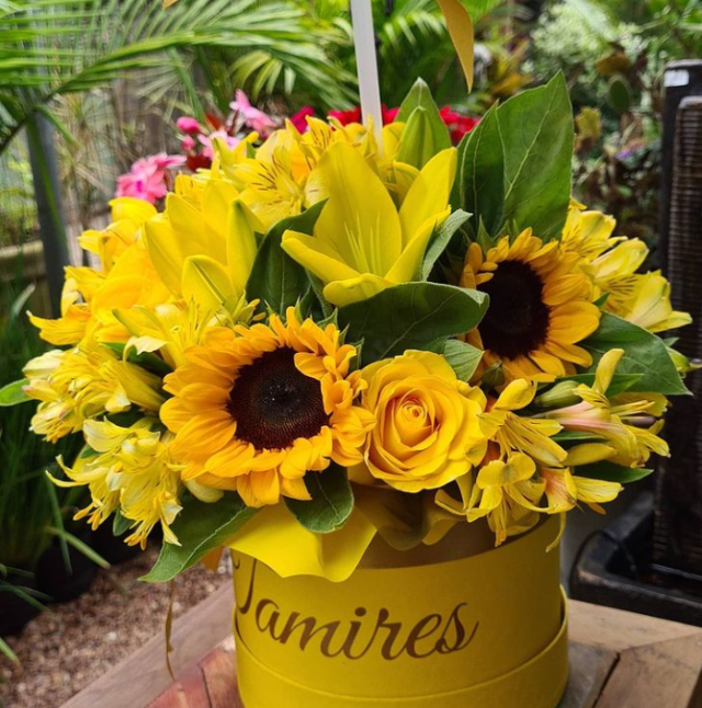 Box Amarela, cetim dourado, girassol, rosas amarelas, lirios e alstroemerias amarelas.