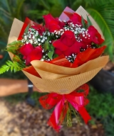 Buque com 06 rosas abertas vermelhas, embalagem em papel craft